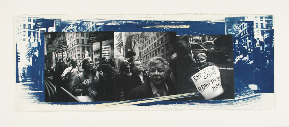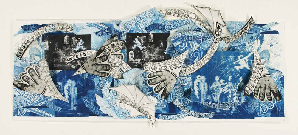 In these cyanotype collages I recreate events and street scenes that I have photographed. Although the medium is primarily cyanotype, I sometimes choose to include silver gelatin prints and inkjet prints of my drawings in the construction of the final 3 Dimensional image.